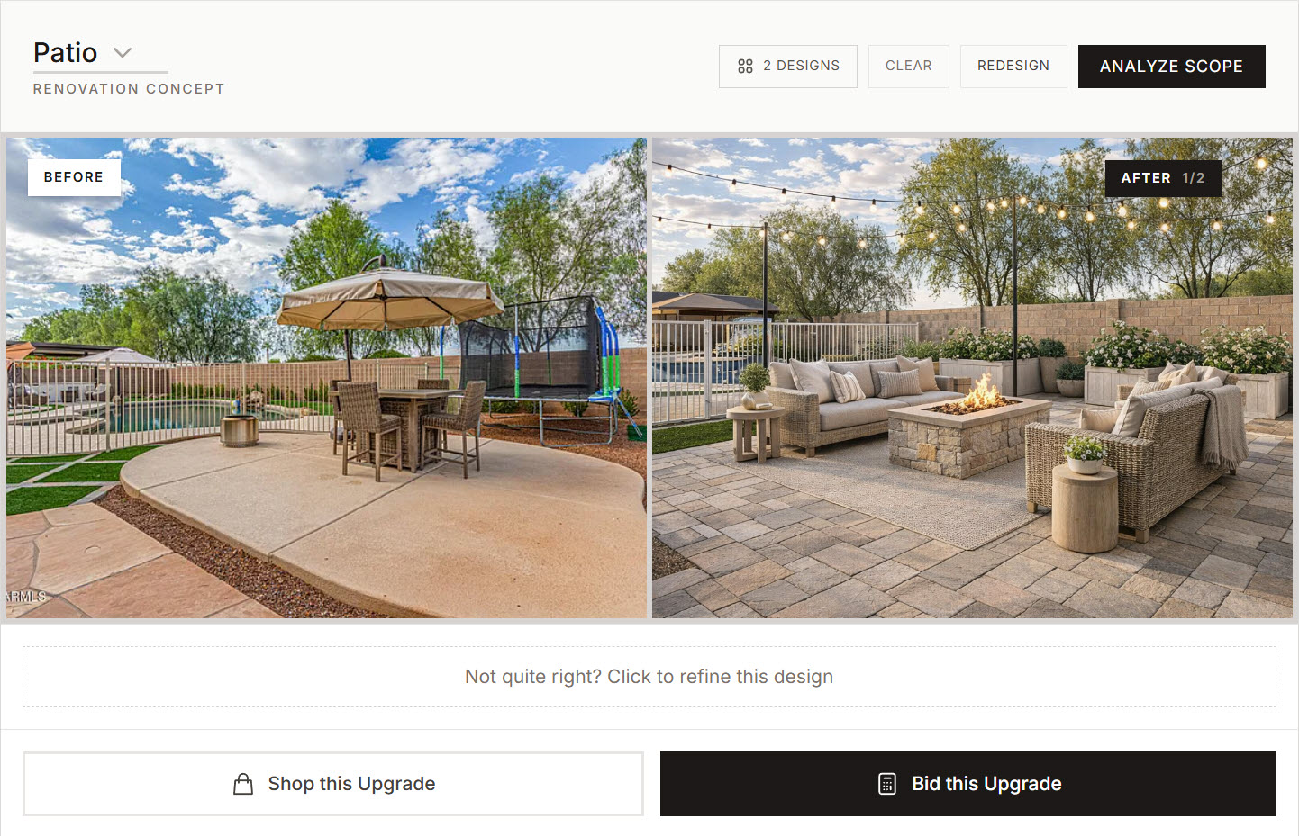 From basic concrete to luxury outdoor living — fire pit, sectional seating, and string lights. Shop every item directly.